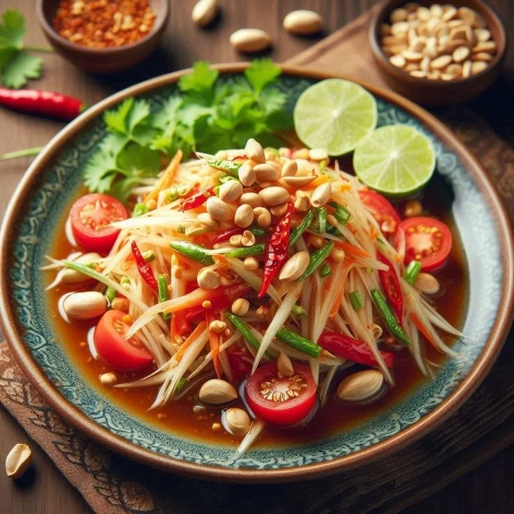 Salade de papaye verte râpée avec une sauce de poisson, citron vert, crevettes séchées et cacahuètes
