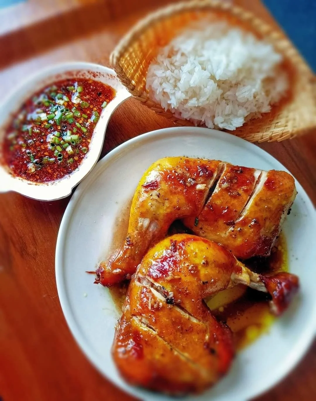 Brochettes de poulet marinées puis grillées, accompagnées d’une sauce satay